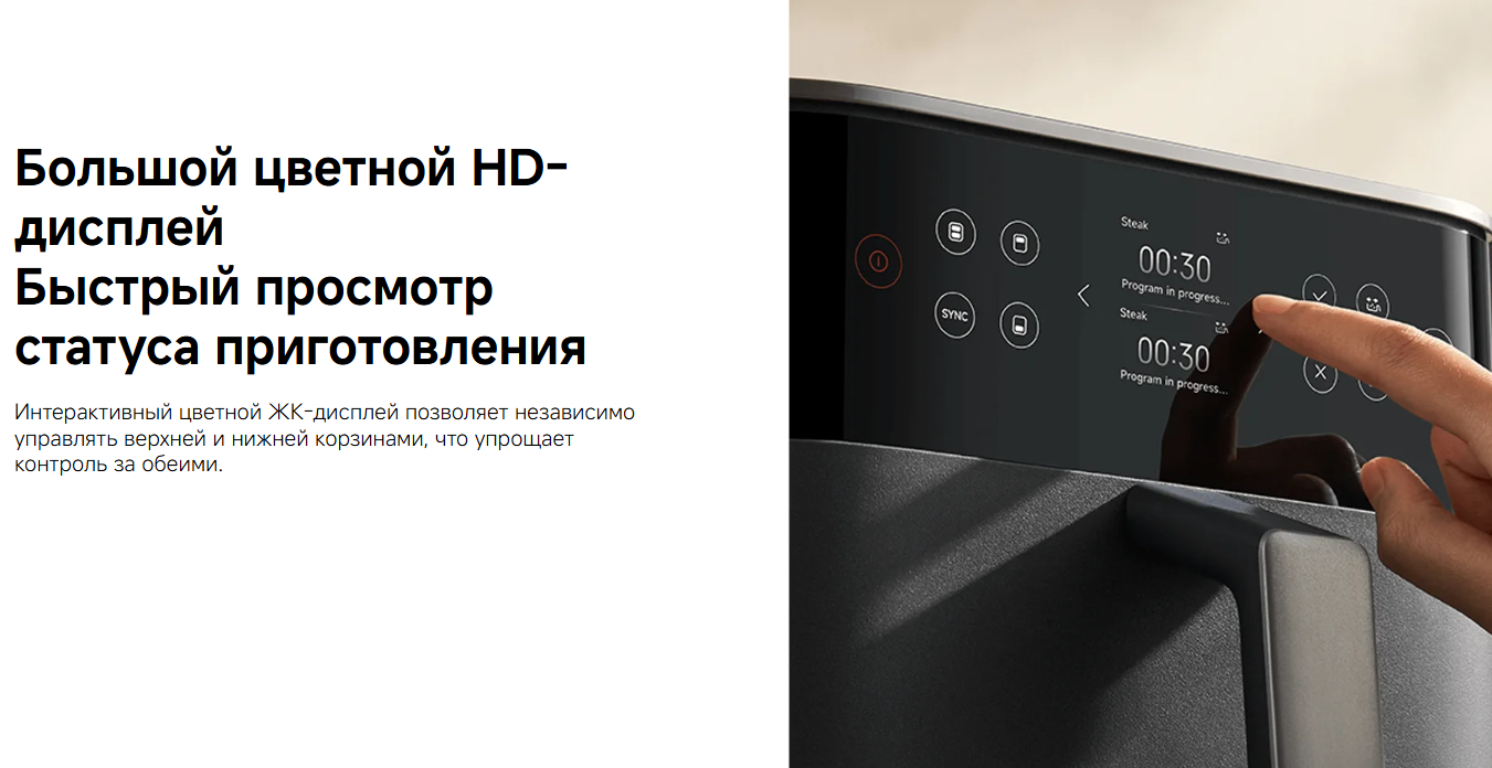 Xiaomi Smart Double Stack Air Fryer — вместительная аэрофритюрница с двумя корзинами и общим объемом 12 литров. Подходит для приготовления блюд на большую семью или для одновременной готовки разных продуктов.